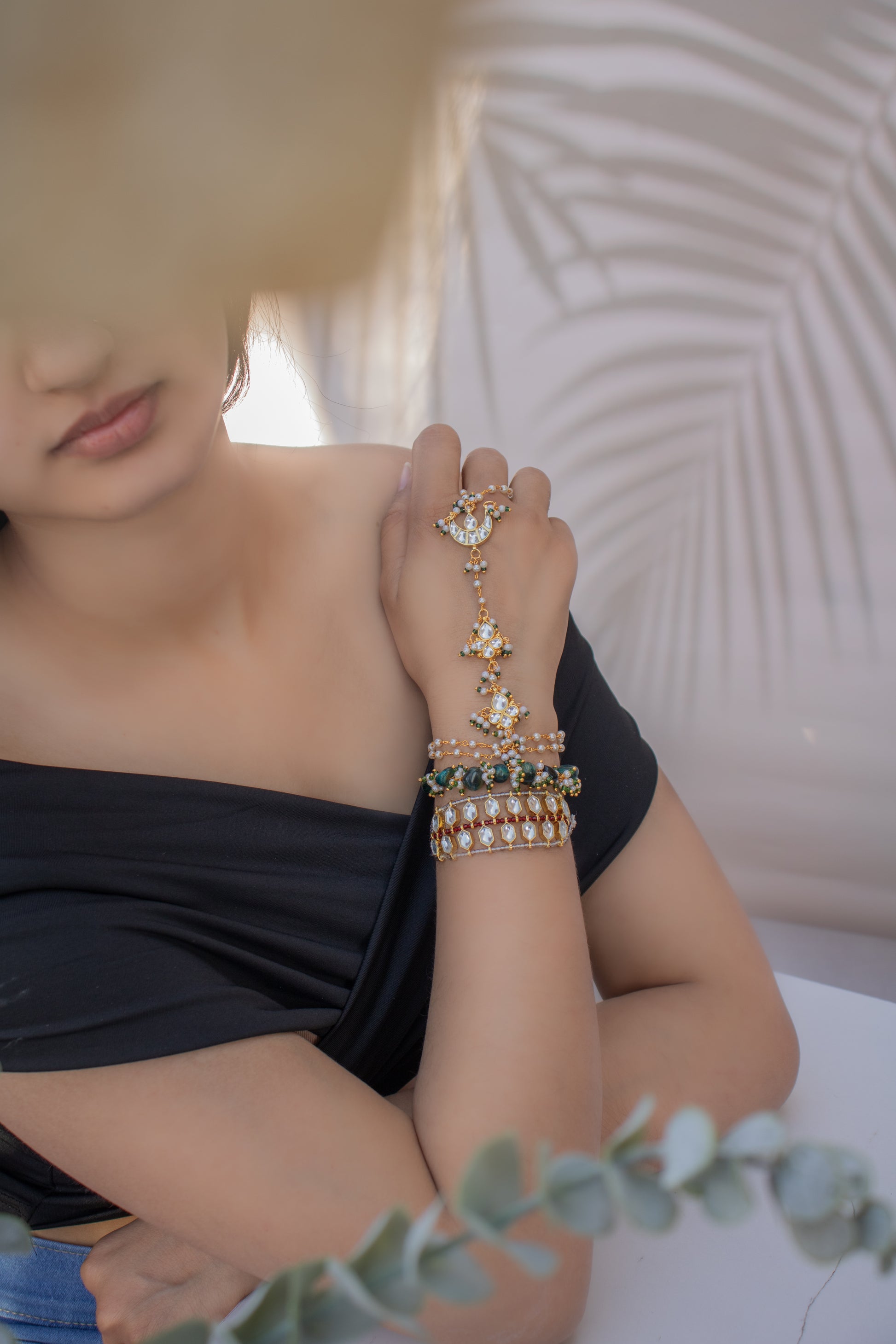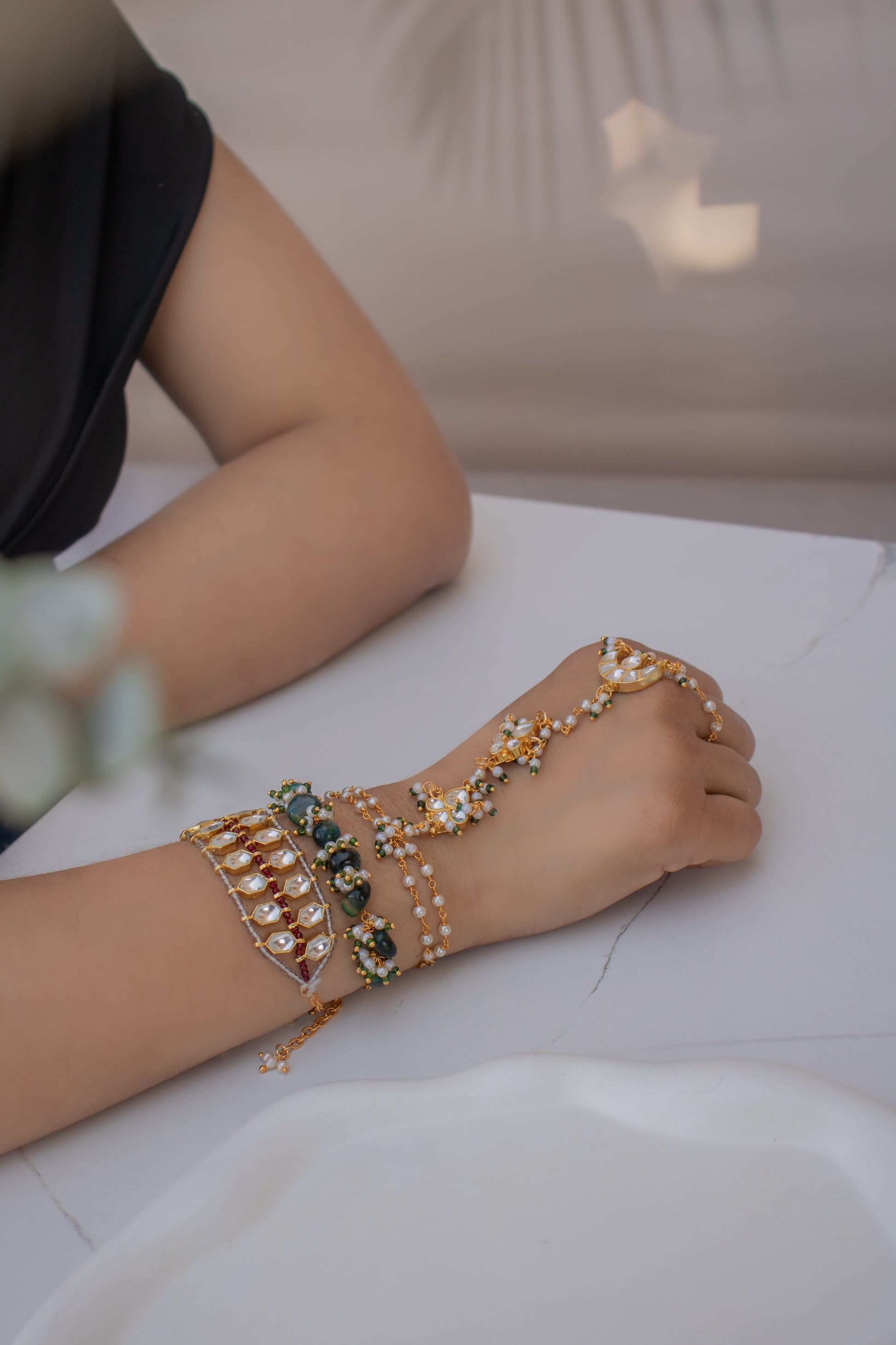 Elevate your ensemble with our exquisite bracelet set featuring a captivating Kundan hathphool, a delicate bracelet adorned with intricate designs, and a stunning green semi-precious stone bracelet, that exudes elegance and charm.