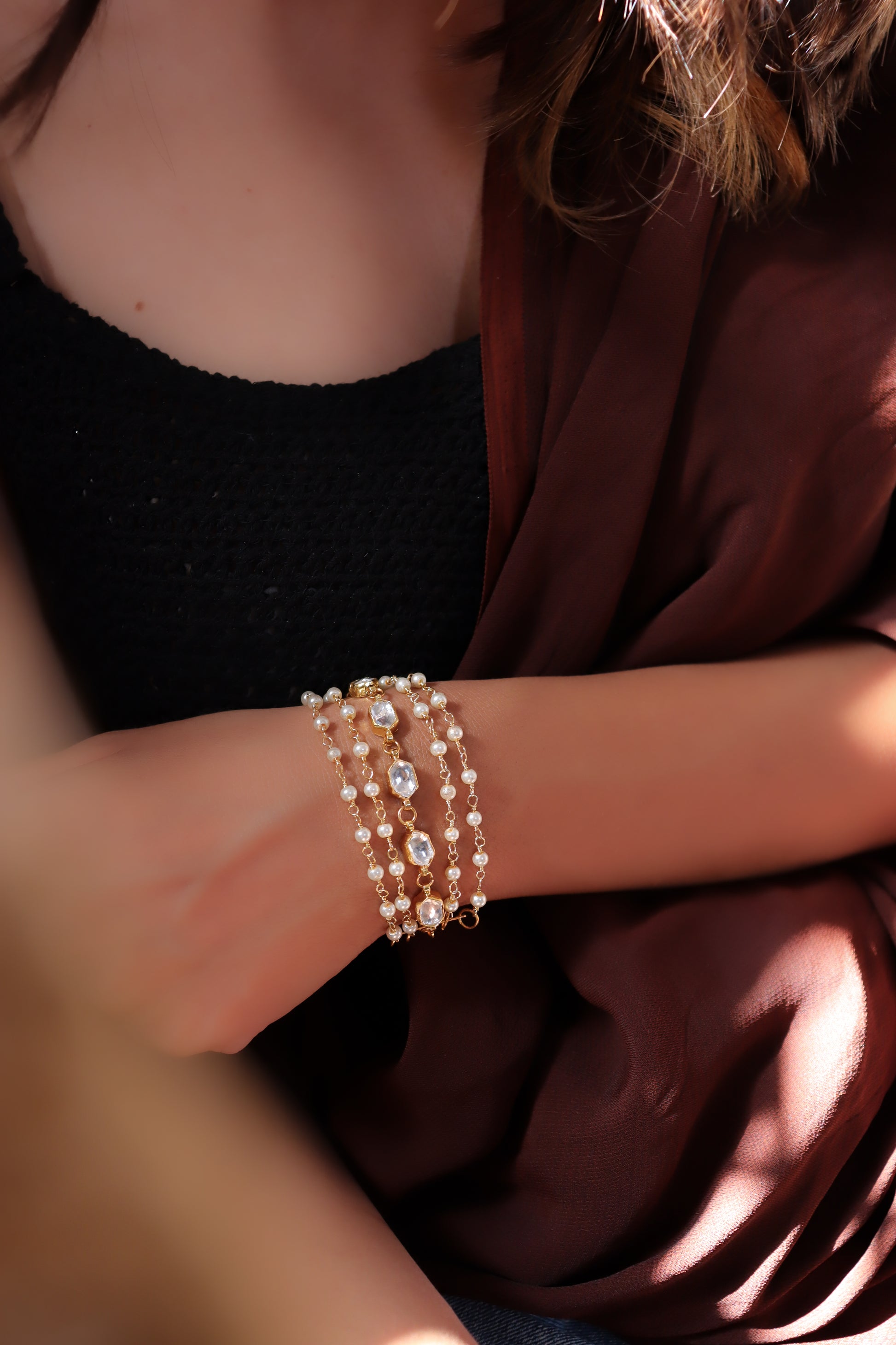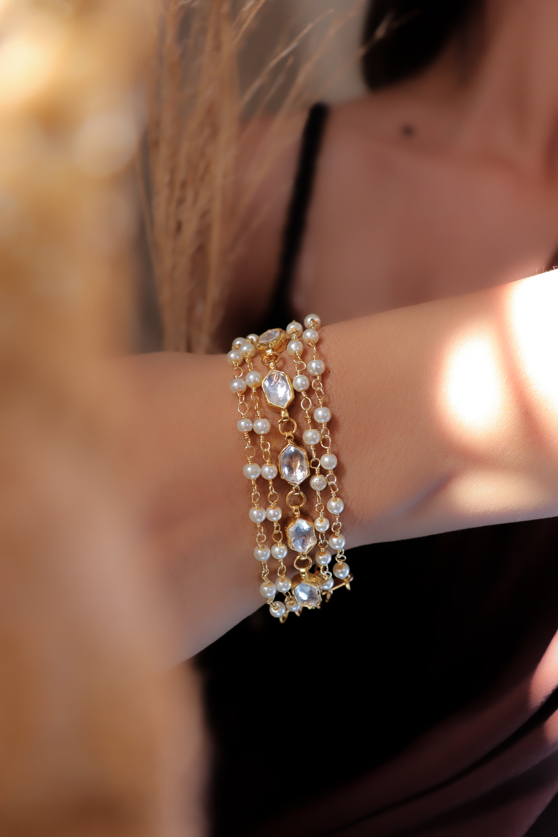The Shamam bracelet is a beautiful design featuring pearls and kundan depicting a mesmerizing design.
