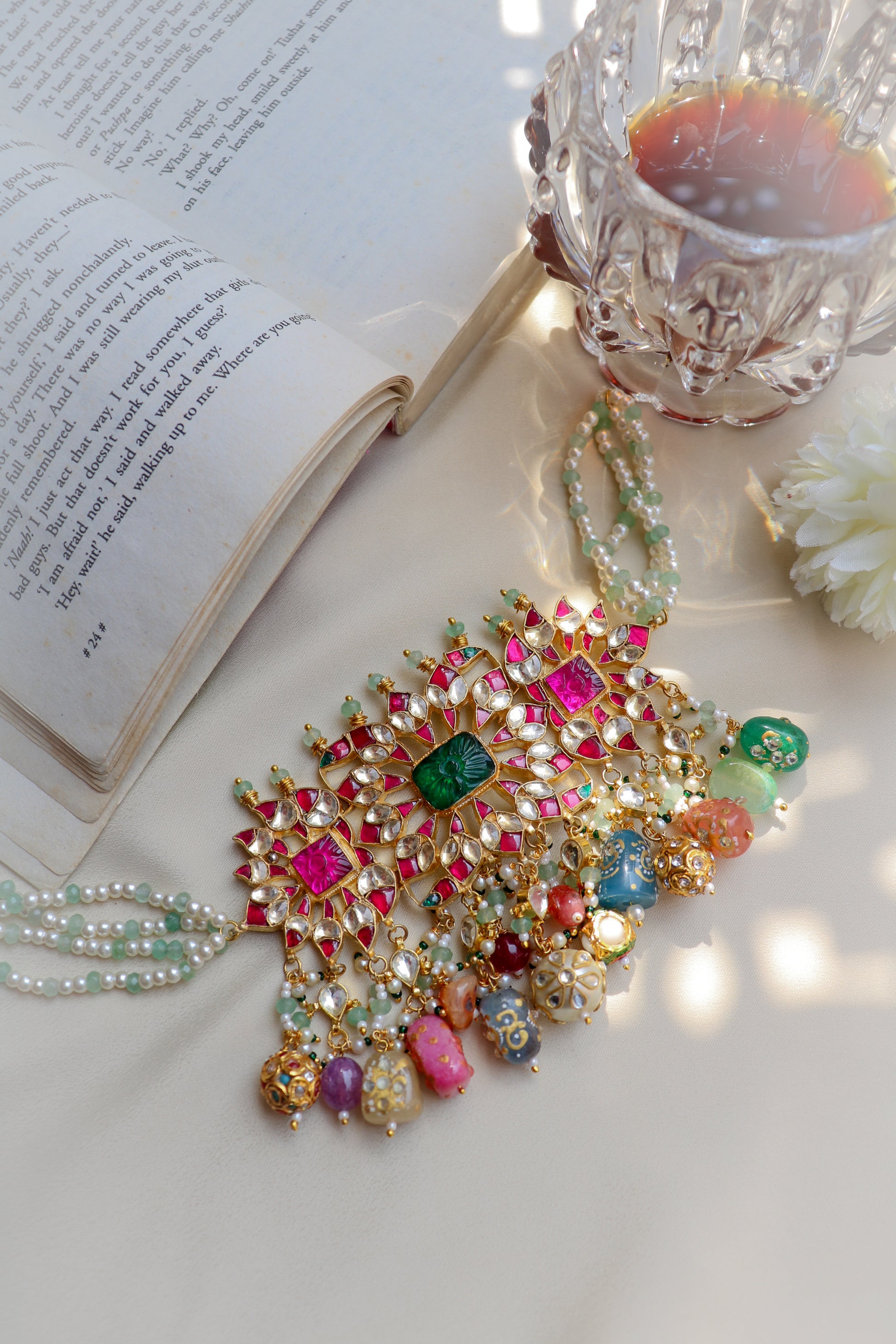 Skillful craftsmanship meets rich colors and textures in this flamboyant necklace. The Shipra necklace features a sophisticated kundan design with skillfully put together stones that make this experimental jewellery a masterpiece.