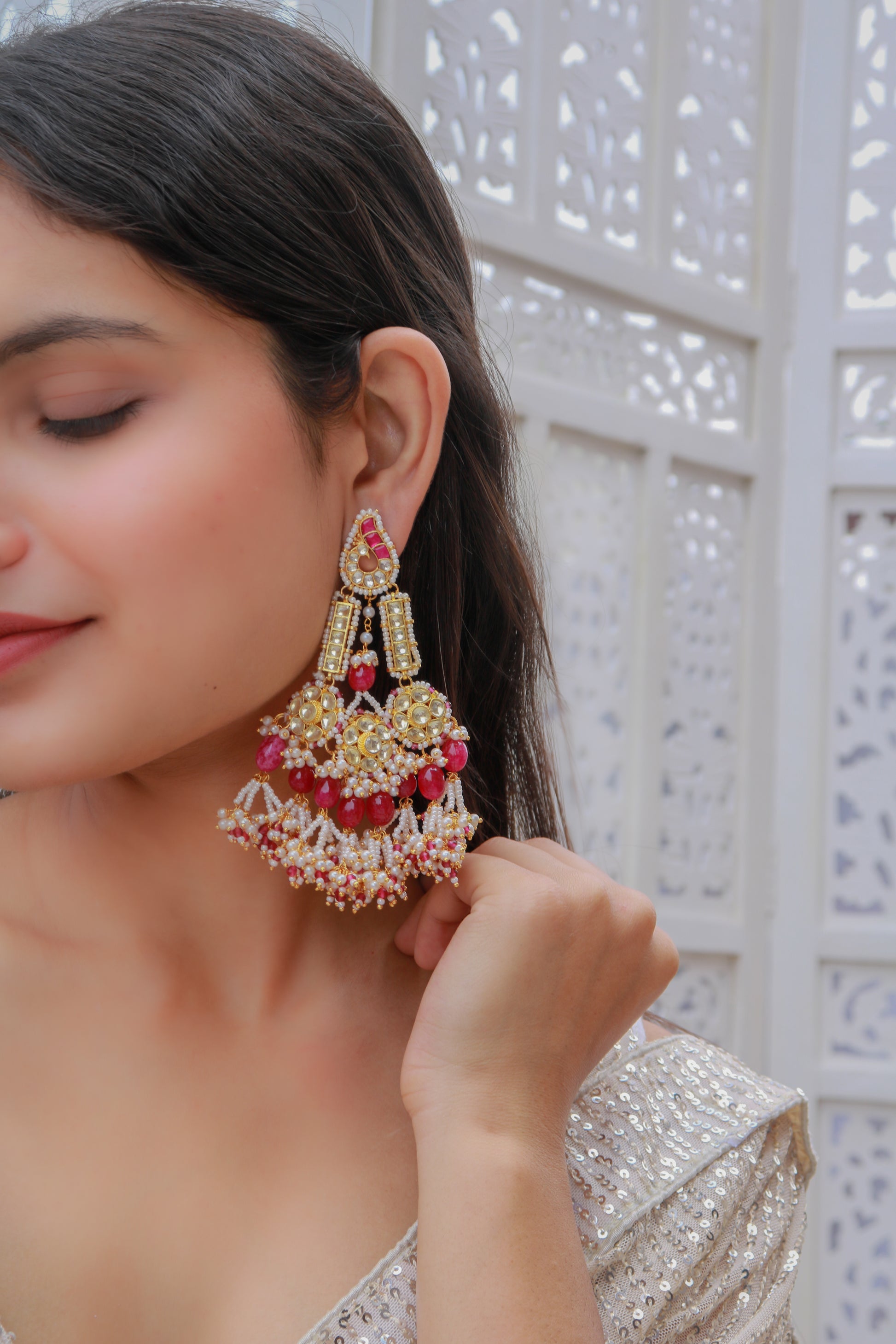 These handcrafted earrings feature intricate floral kundan units, elegantly suspended with white pearls and vibrant rani pink semi-precious stones. A stunning combination that adds a touch of charm and sophistication to any look.