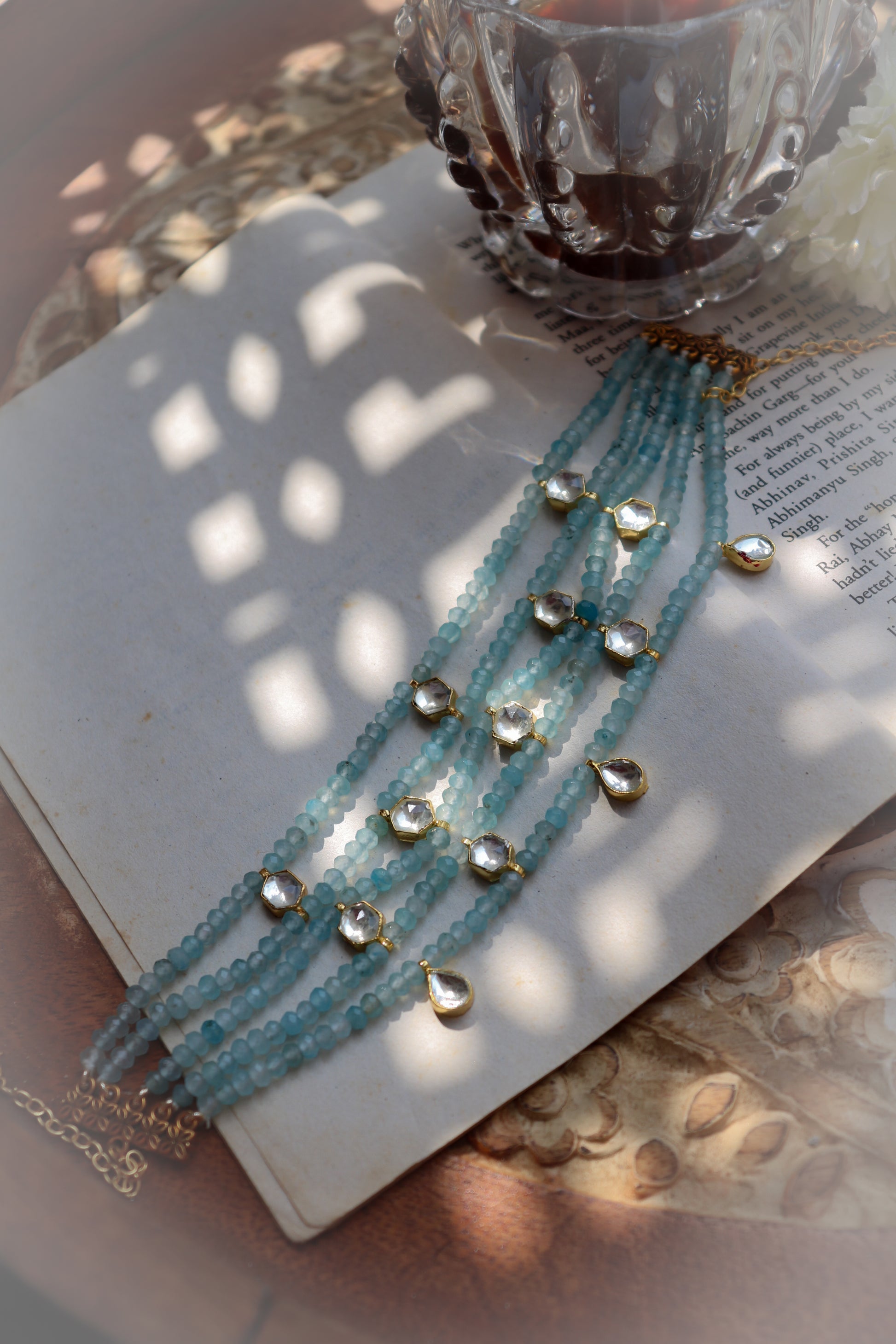 The Sitwa necklace features oodles of blue stones. The pool of blue is dotted with kundan units.
