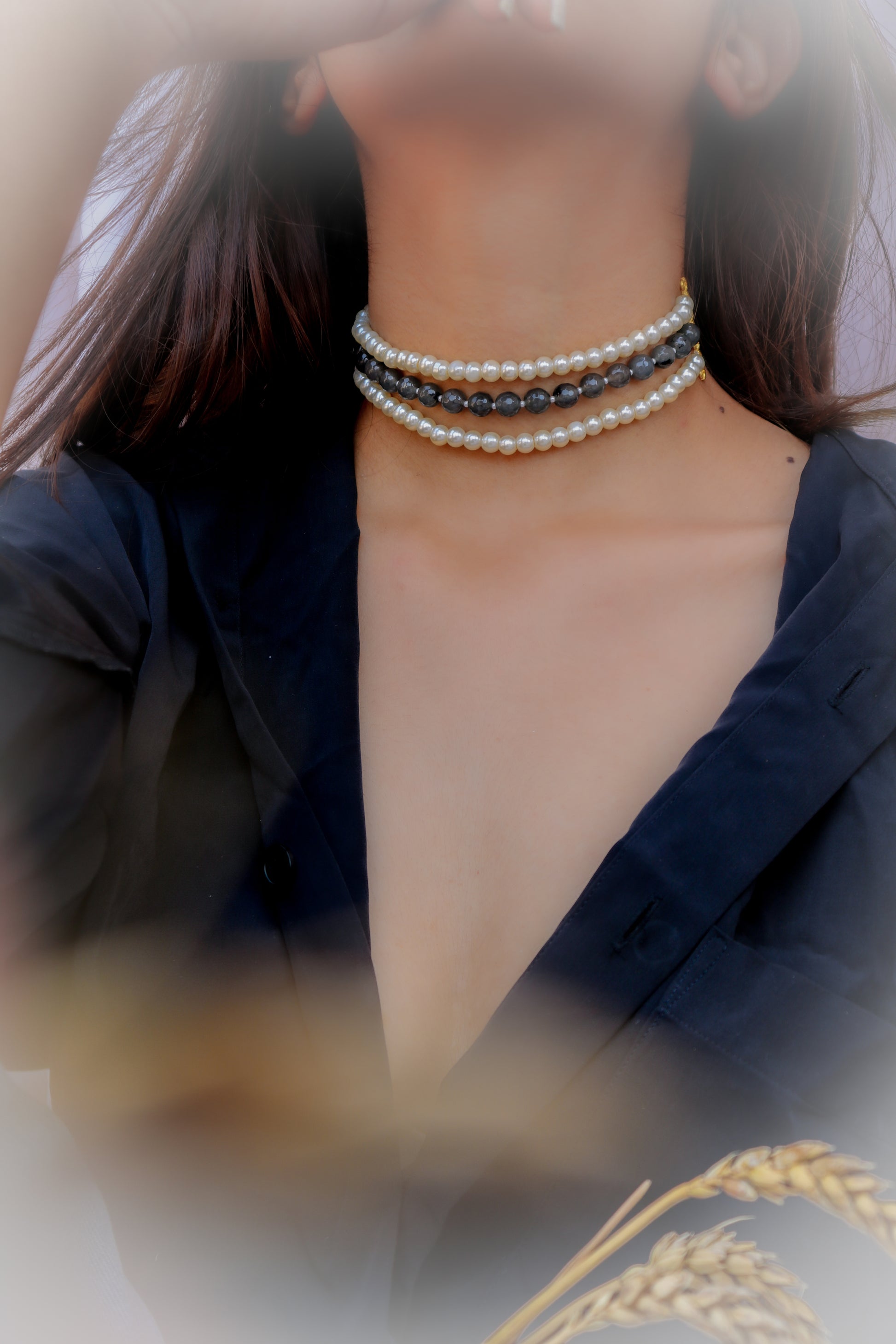 A captivating grey onyx and pearl necklace that combines the grace of pearls with the stunning beauty of grey onyx. The result is a lovely piece of jewelry that beautifully complements any outfit.