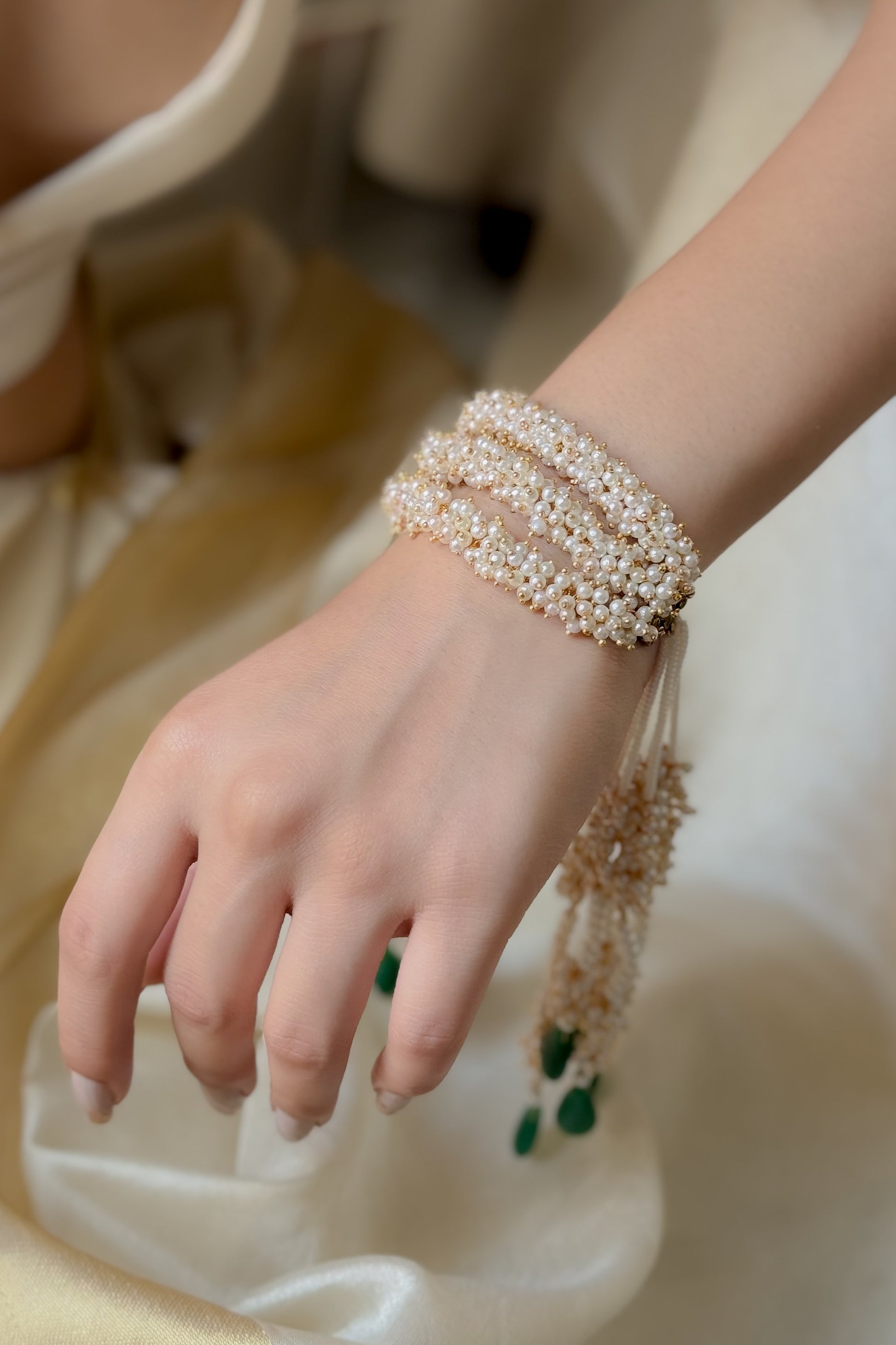 A very beautifully handcrafted pearl bracelet, this piece is a magnificent amalgamation of a bracelet and kaleeras. Adorned with lustrous pearls, delicate pichais, and graceful green drop-shaped semi-precious stones dangling through, it radiates elegance. A perfect accessory to elevate your haldi and mehendi looks with charm and tradition.